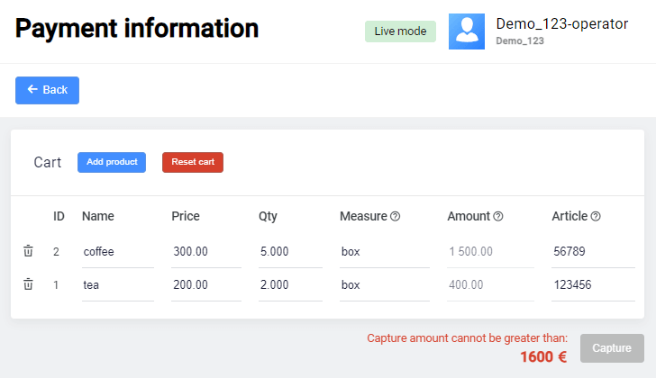 As an example, let's say the percentage by which the deposit amount may exceed is set at 100% in the settings. You have entered an amount of 800 EUR in the payment form. Then you can modify the cart so that the capture amount does not exceed 1600 EUR. If it does exceed, an error message will appear and the Capture button will become disabled.