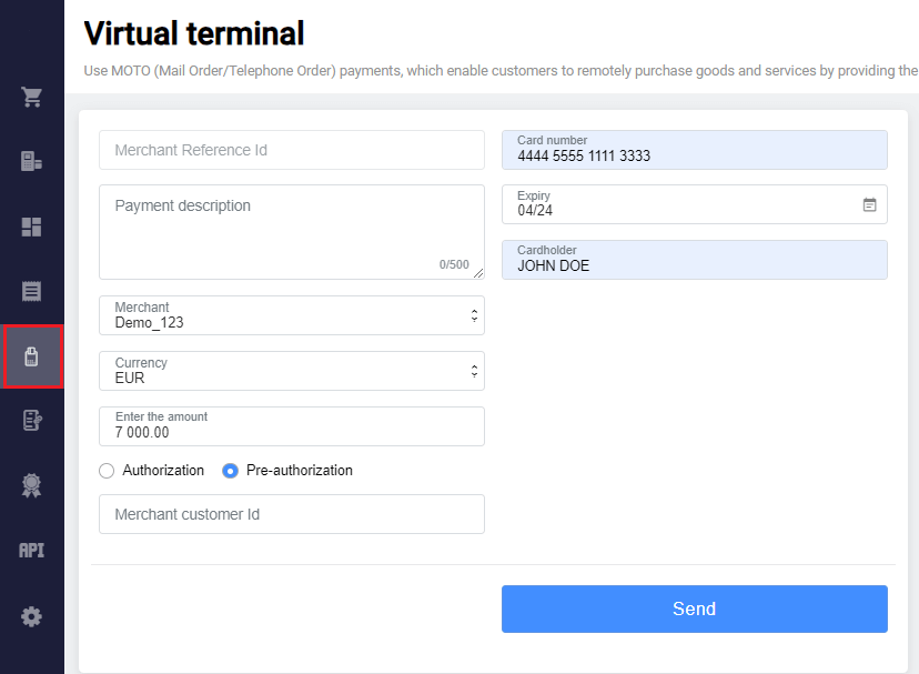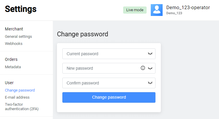 Merchants can create a payment flow as needed. For example, design own fully customized payment page. See more information about API in the API Reference. We authenticate your API requests using the API key - a unique combination of symbols associated with your account. Read about using API key in requests here.