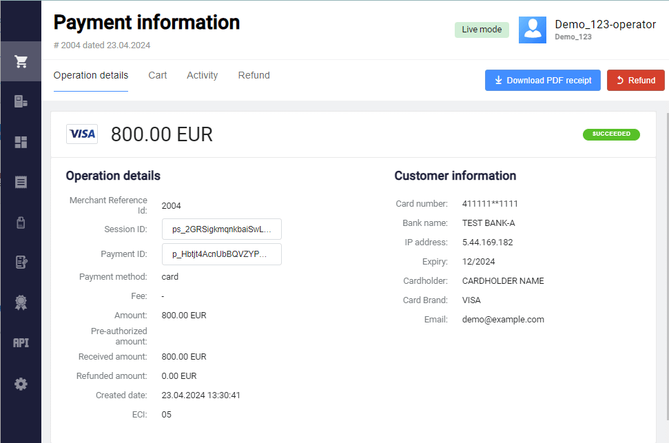 - In case of payments without a shopping cart in the Succeeded status, the Refund button opens the refund confirmation window.