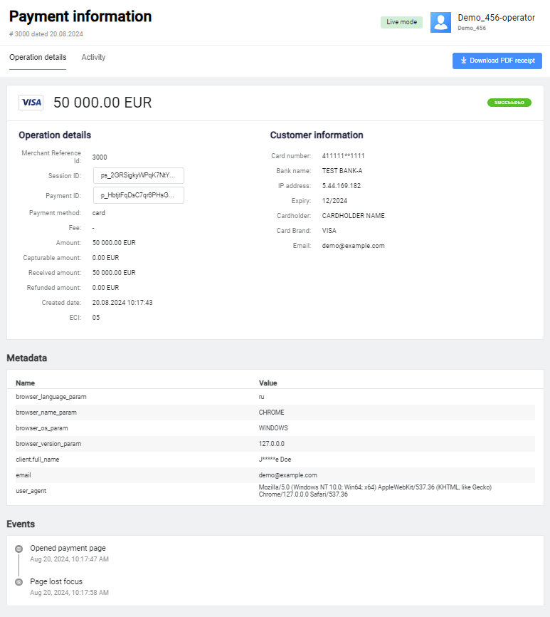 Events section displays specific actions the customer takes during the payment process, such as "Open payment page", "Page lost focus", "Clicked on the field card number", etc. This allows you to understand customer behavior and, therefore, create a more intuitive and smoother payment process.