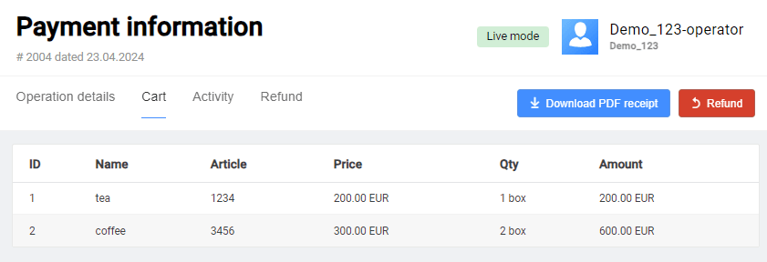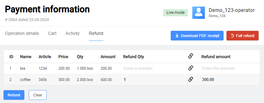 - In case of payments with a shopping cart in the Succeeded status, the Refund button opens the Refund tab, where you can select line items to be returned or refund the entire amount of the order. The refund process for such orders is described here.