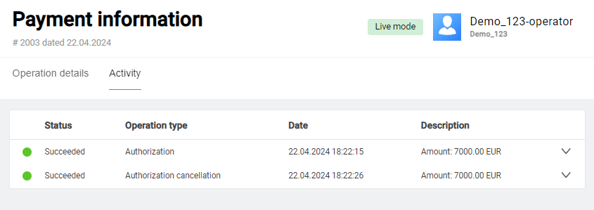 The Activity tab contains information about all events relevant to the payment: authorizations, cancellations, refunds, etc.