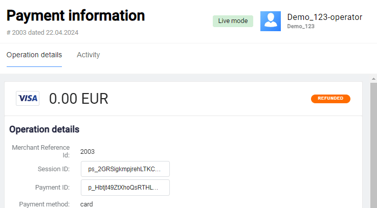 Check the data, change it if necessary and click on the Capture button. After the completion, the payment gets Refunded status.