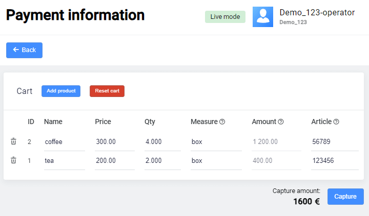 Check the data, change it if necessary and click on the Capture button. After the completion, the payment gets Succeeded status.