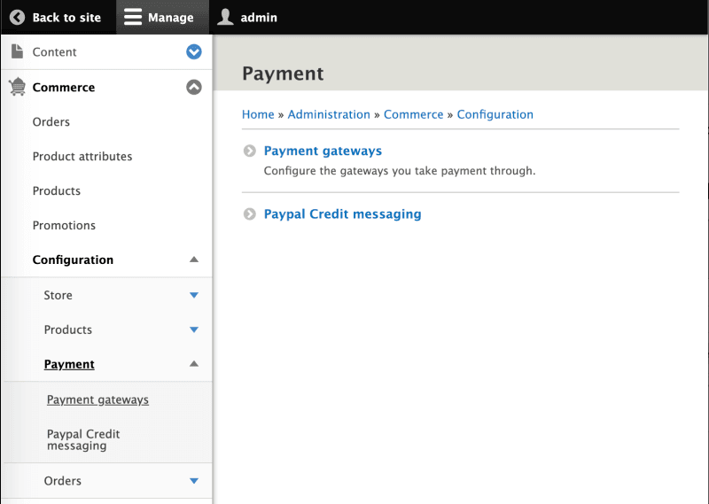 - Log in to your site as administrator and select Administration > Payment methods.