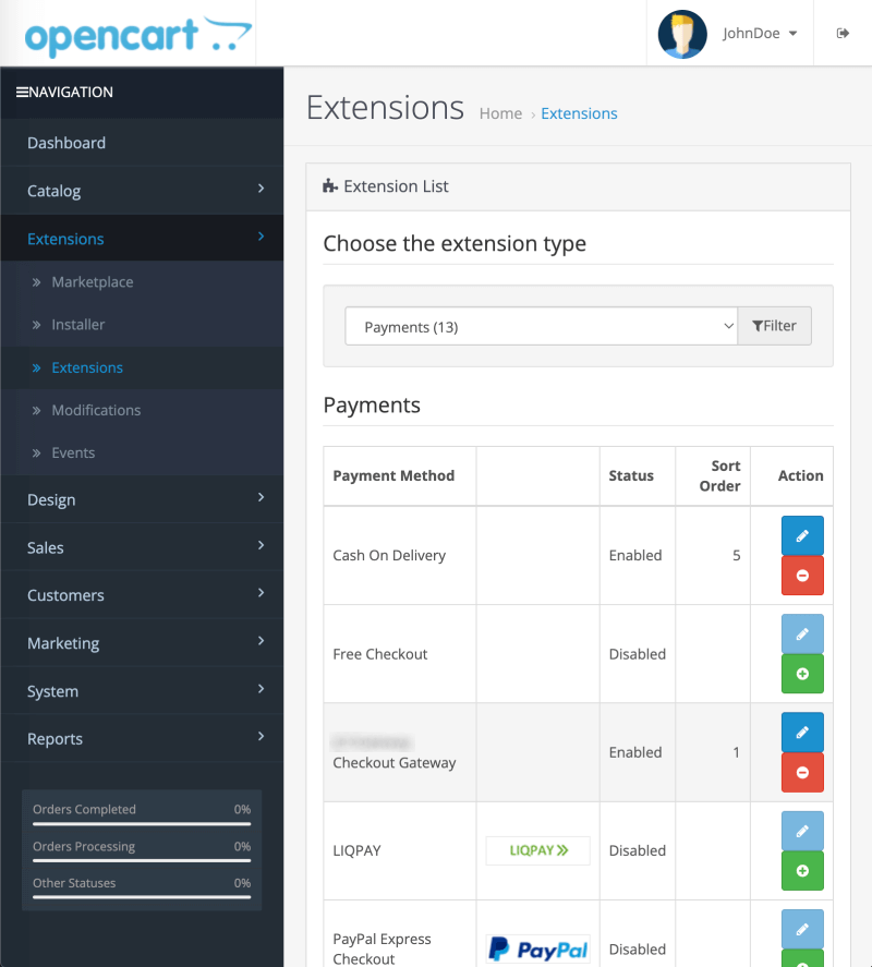 - In the side menu select Extensions > Extensions. In the Choose the extension type select Payments. The page will look as follows.