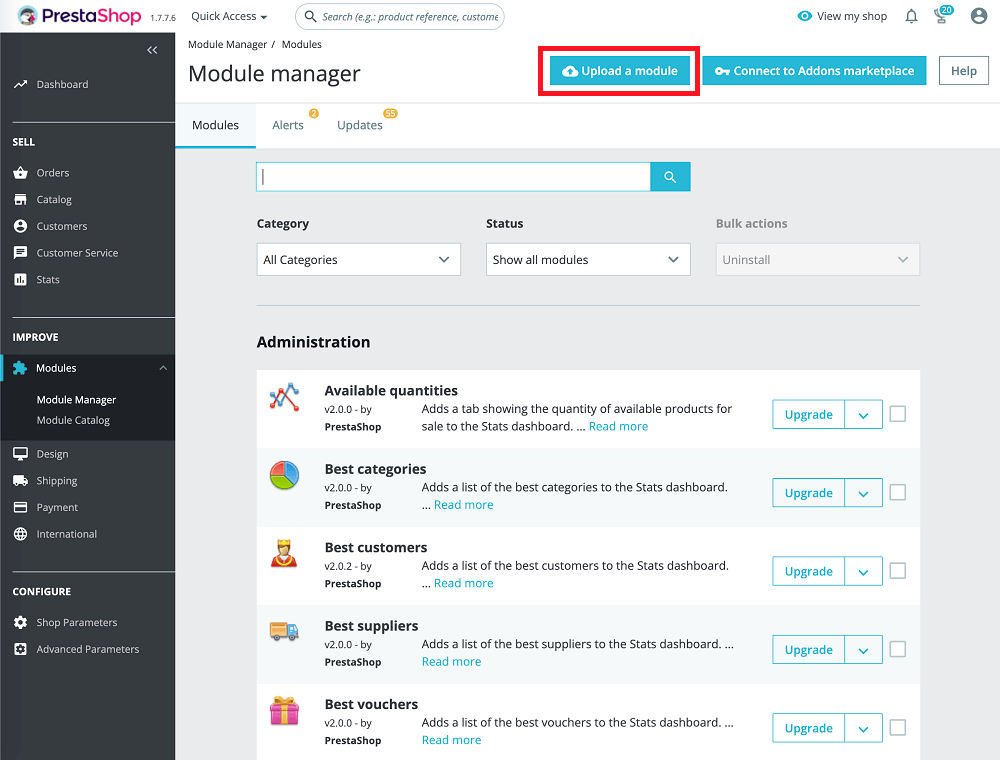 - Sign in to PrestaShop administrative panel and in the side menu select Dashboard > Improve > Modules > Module Manager.