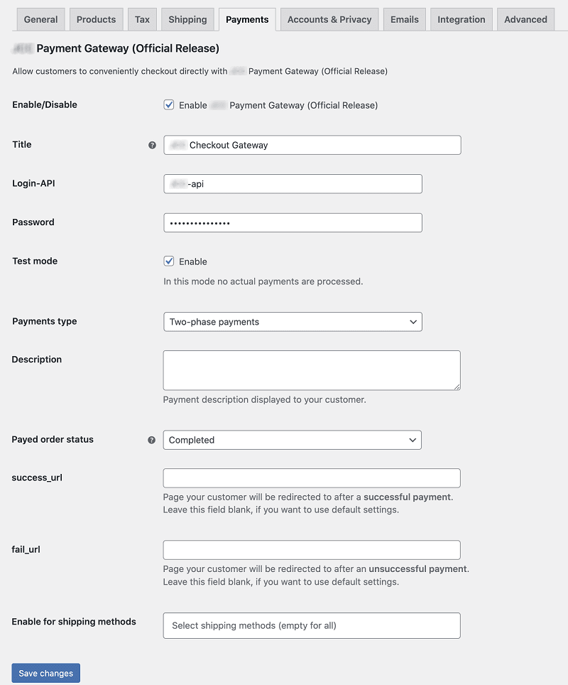 | Payments type | Enables/disables two-phase payments. |