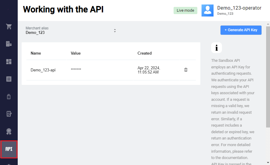 Merchants can create a payment flow as needed. For example, design own fully customized payment page. See more information about API in the API Reference. We authenticate your API requests using the API key - a unique combination of symbols associated with your account. Read about using API key in requests here.
