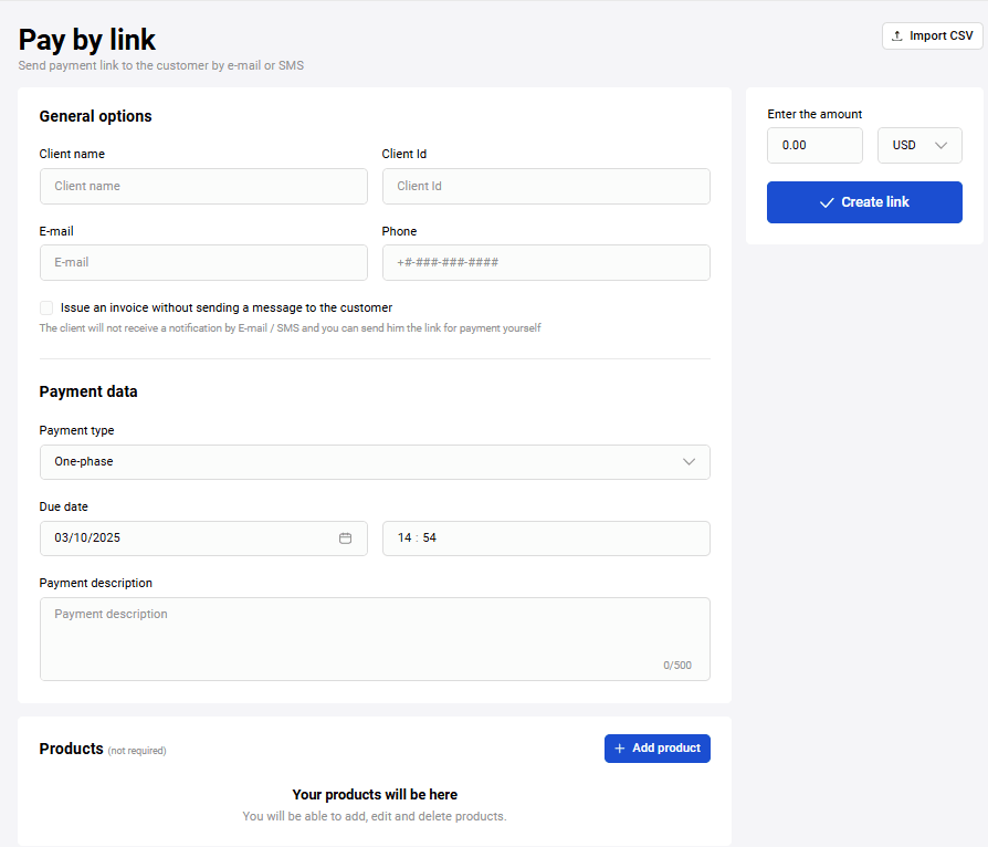When generating an invoice, you can add a shopping cart for the order. The Products section is located below the area for creating a link to payment page: